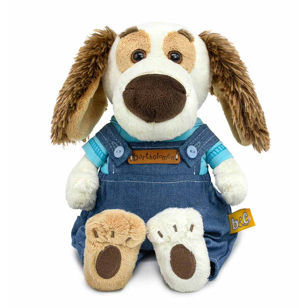Малыш Бартоша в классном в полукомбинезоне на лямочках с голубыми пуговками. Полукомбинезон сшит из денима синего цвета с серым оттенком, а по талии присобран на резинку и отделан контрастной строчкой. Спереди на грудке пришит лейбл с именем. В комплекте футболка из х/б трикотажа небесно-голубого цвета.