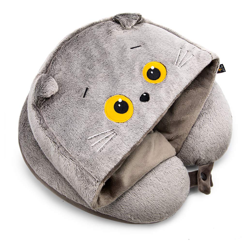 Удобная подушка на шею для путешествий и отдыха с капюшоном в виде мордочки кота Басика. Подушка и капюшон сшиты из оригинального меха в сочетании с софтом графитово-серого цвета. Капюшон выполнен с аппликацией, вышивкой, милыми ушками и уютной подкладкой. Подушку можно зафиксировать на шее с помощью кнопки.