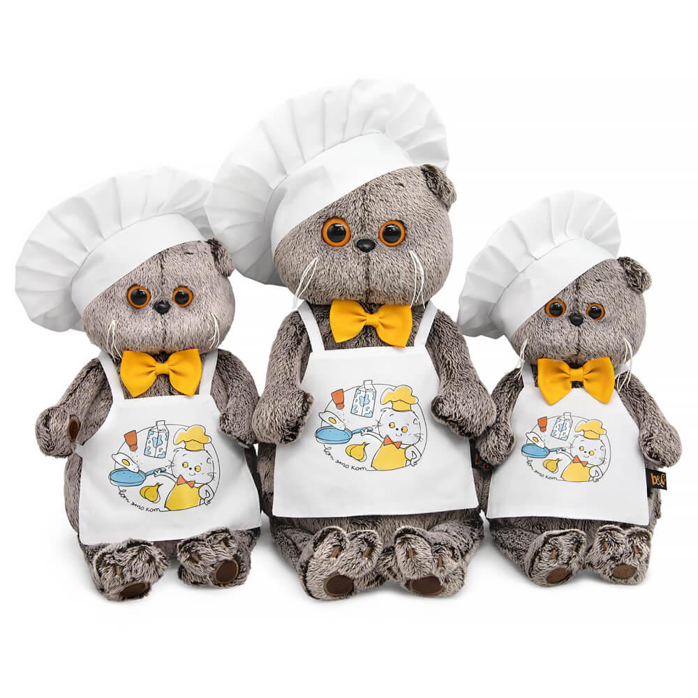 Басик снова в образе шеф-повара. На коте фирменный белый фартук с авторским принтом, объёмный поварской колпак из плотного белоснежного хлопка и неизменный галстук-бабочка.