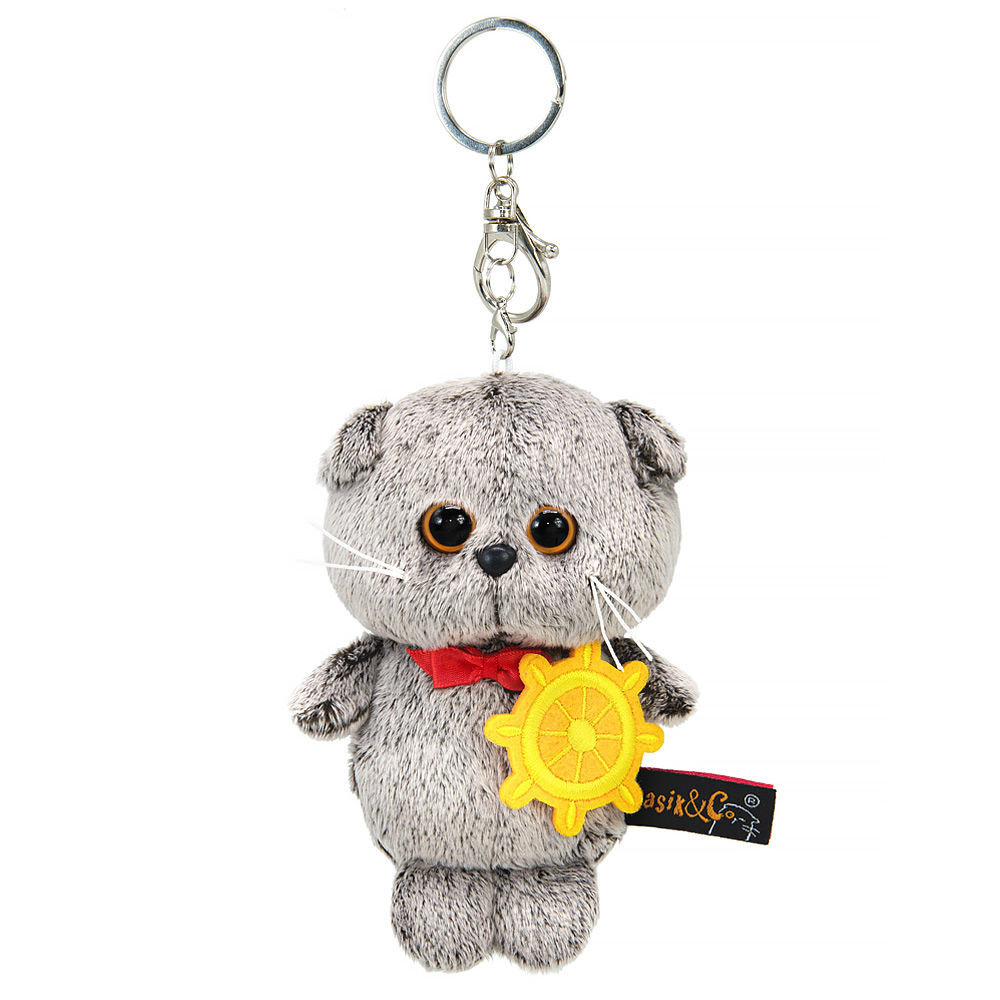Малыш Басик со штурвалом и с красным атласным бантиком. Штурвал выполнен из фетра золотисто-охристого цвета с вышивкой. У брелка удобный составной карабин с кольцом и застежками.