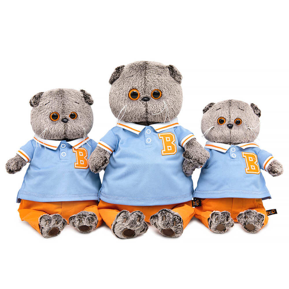 Басик в очень модном комплекте. Плотные брючки цвета оранжевого пламени и трикотажная рубашка-поло лазурно-голубого цвета. Рубашка сшита с воротником и манжетами из трикотажной белоснежной резинки с оранжевой полоской. А также украшена именной монограммой на груди.