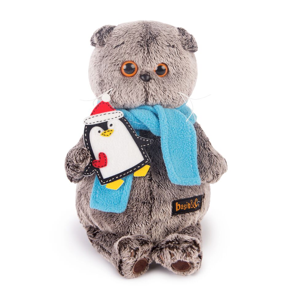 На Басике мягкий шарфик из флиса небесного цвета. В лапках Басик держит фетрового пингвина, оригинальную игрушку на пальчик Такой игрушкой можно играть отдельно и даже собрать свой пальчиковый театр.