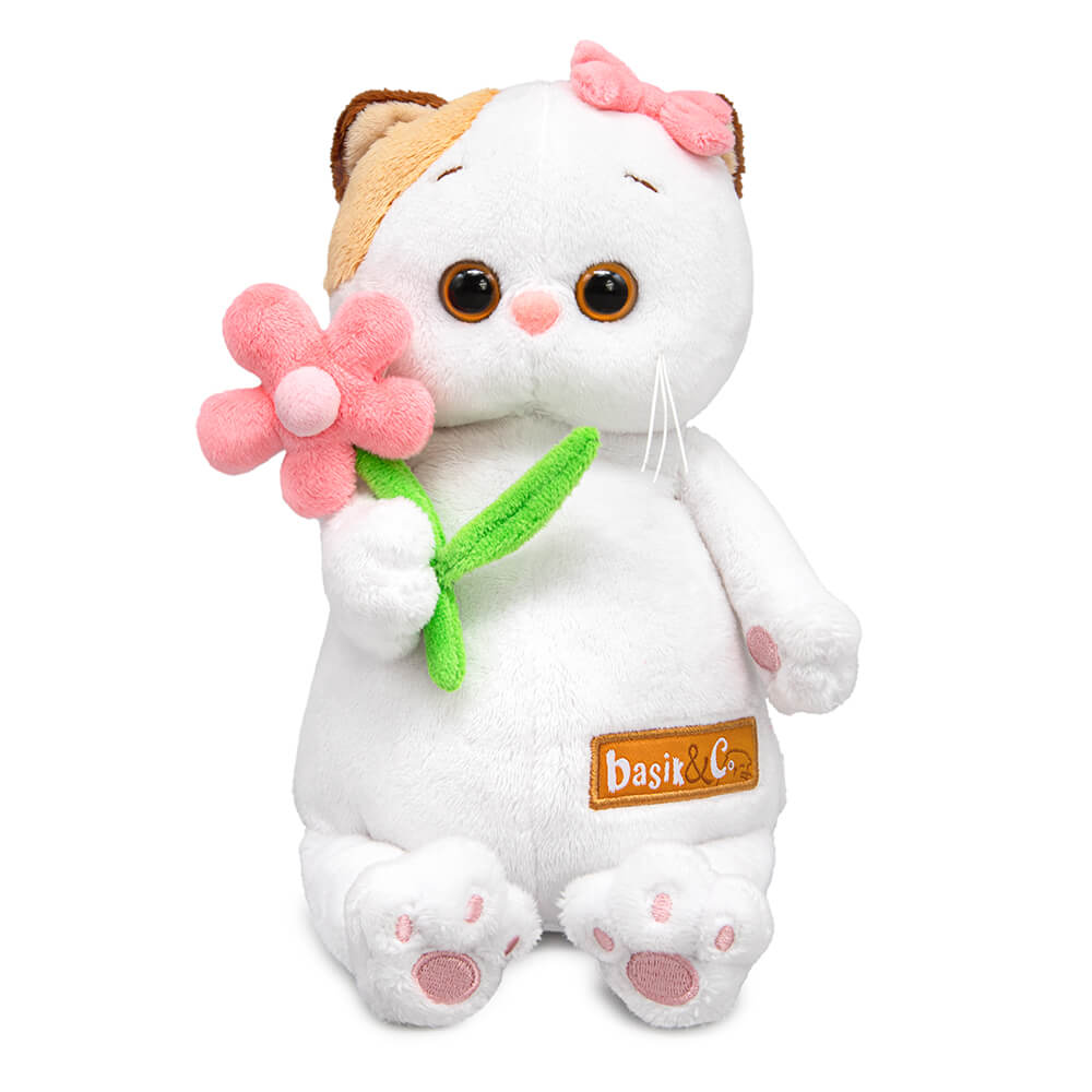 Кошечка Ли-Ли держит в лапках крупный цветок из розового и салатового софта с объёмной бледно-розовой серединкой. На ушке Ли-Ли её любимый розовый бантик. Кошечка представлена в фирменной коробке с дизайном в стиле мультсериала «Кот Басик».