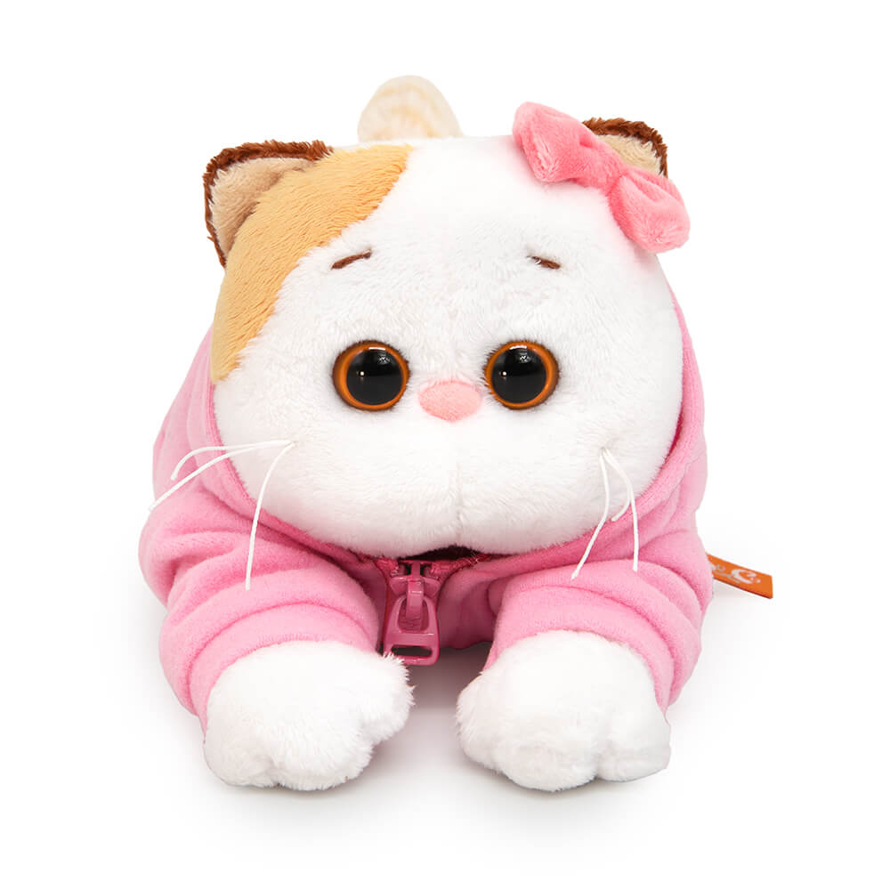 Кошечка Ли-Ли в модном худи из флиса цвета розовой карамели. Худи сшито с капюшоном, с розовой зип-молнией и принтом в виде цветка сбоку на спинке. На ушке Ли-Ли её любимый розовый бантик.