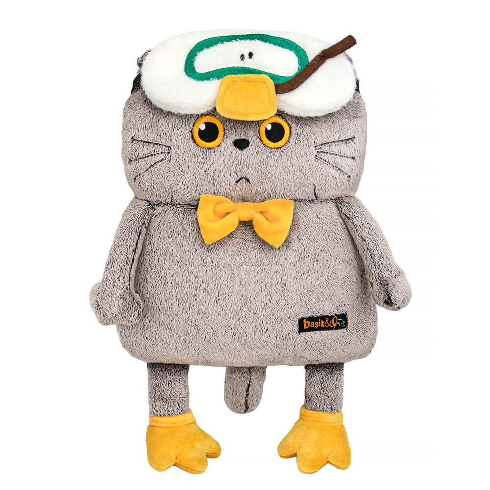 Кот Басик подушка с забавной маской для сна в виде Гусика в плавательной маске и с трубкой. Также на Басике милые тапки в виде лапок гуся из софта охристого цвета.