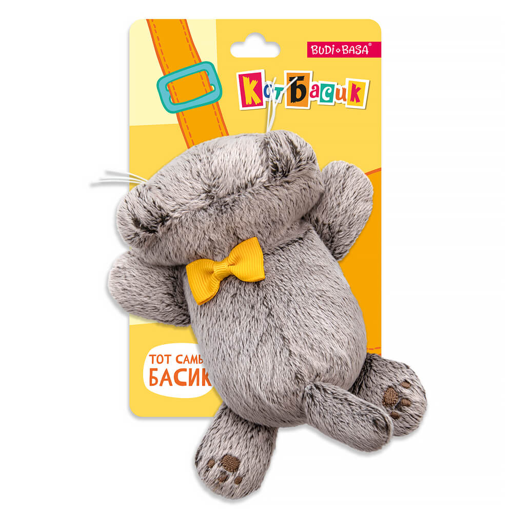 Малыш Басик удобно расположился на животике. У котика на шее бантик из сутажной ленты золотисто-охристого цвета. Дополнительный функционал – застежка с липучкой, с помощью которой Басика можно прикрепить, например, на ремень сумки или лямку рюкзака. Кот Басик с бантиком лежачий на липучке представлен на фирменной подложке.