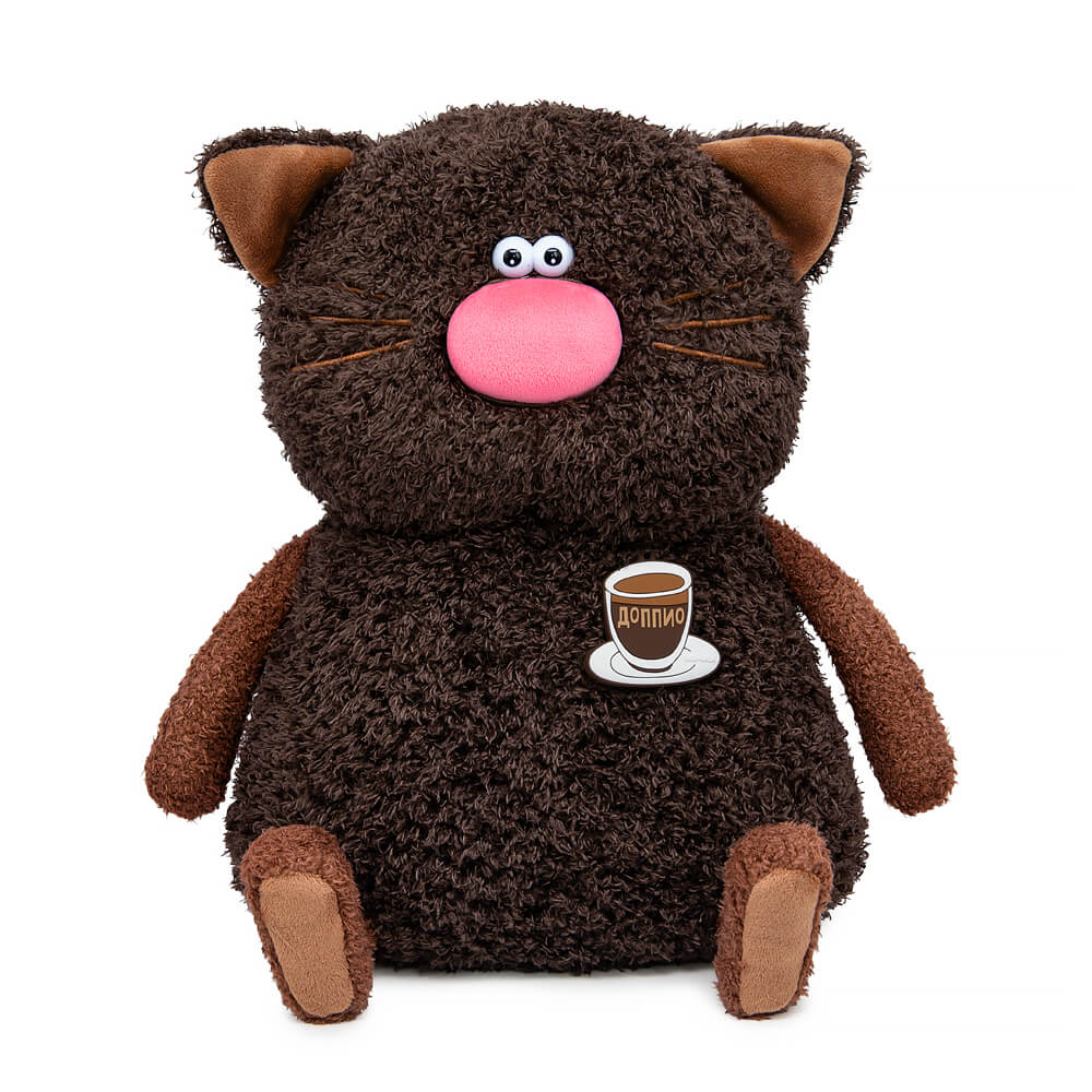 Классный кот-подушка Доппио из тактильно приятного эко меха цвета горького шоколада. Лапки из более короткого меха цвета кофе. Усики из шелковистого крученого шнура. Объемный носик обтянут розовым софтом. Глазки из пластика. На пяточках и внутри ушек вшит медно-коричневый софт. Спереди кота-подушку украшает силиконовый подвес в виде чашечки с кофе доппио.