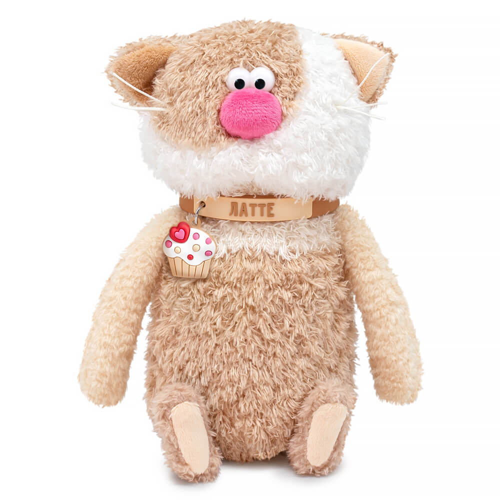 Шикарный кот Латте из тактильно приятного эко меха в трех оттенках: цвета молочного какао, цвета топленого молока и белоснежного цвета молочной пенки. Лапки и хвостик из более короткого меха. Усики из шелковистого крученого шнура. Объемный носик обтянут розовым софтом. Глазки из пластика. Пяточки из софта цвета сливочного крема, а внутри ушек софт сливочного и карамельного цвета. На шейке у кота силиконовый чокер с именем и подвесом в виде пирожного с белым кремом, посыпкой и розовым сердечком. Чокер легко снимается и может послужить в качестве модного браслета для друга.