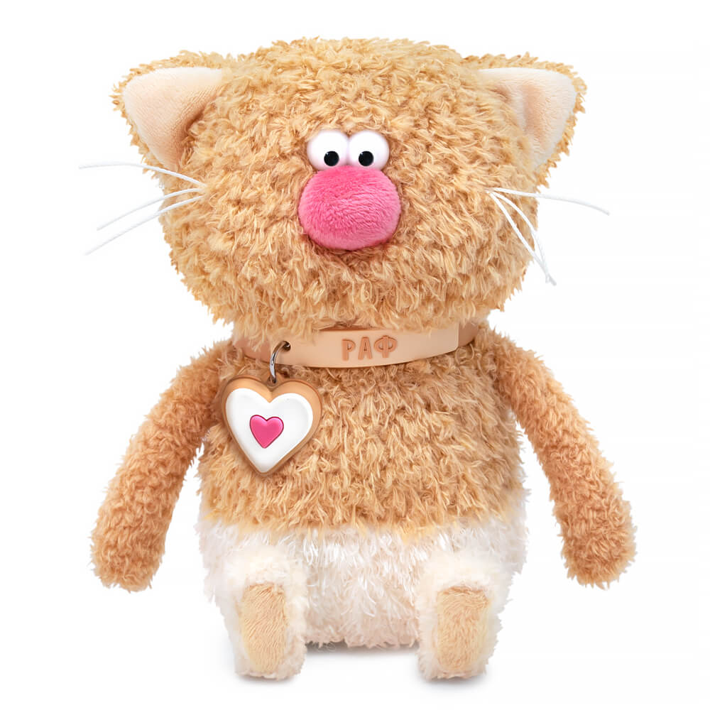 Очаровательный котик Раф из тактильно приятного эко меха в двух оттенках, цвета песочного печенья и цвета топленого молока. Лапки и хвостик из более короткого меха. Усики из шелковистого крученого шнура. Объемный носик обтянут розовым софтом. Глазки из пластика. Пяточки из софта цвета крема, а внутри ушек софт сливочного цвета. На шейке у котика силиконовый чокер с именем и подвесом в виде печенья в форме сердечка с белым кремом сверху и розовым сердечком в середине. Чокер легко снимается и может послужить в качестве модного браслета для друга.