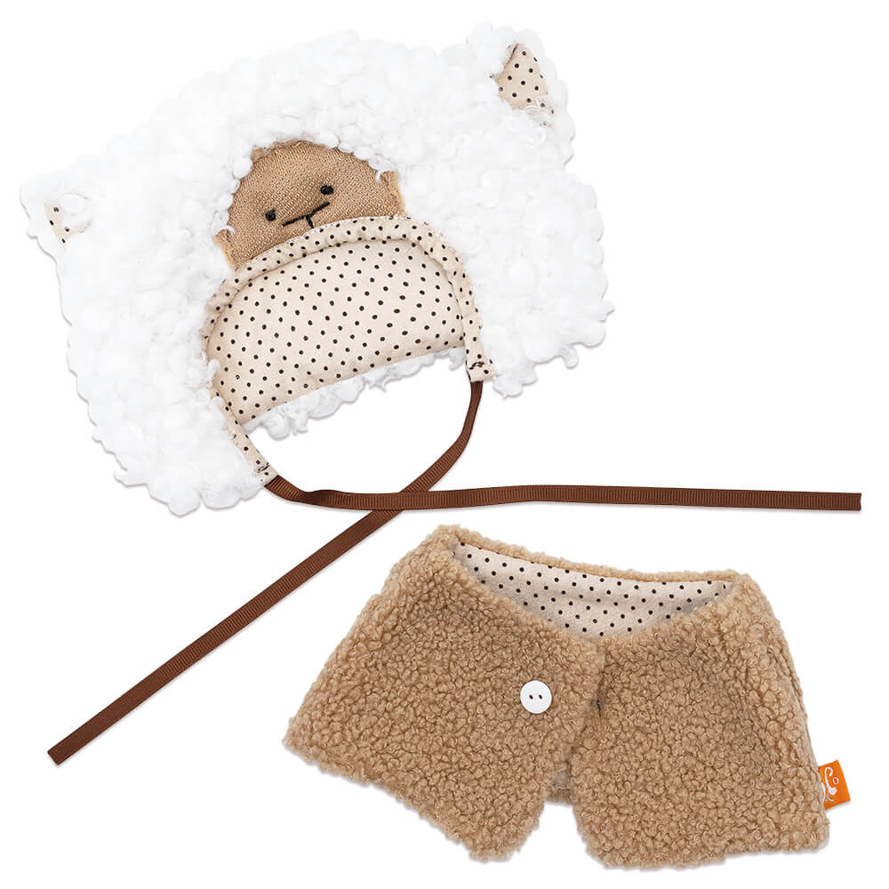 Очень трогательный костюмчик Овечки: объёмная шапочка из кудрявого меха на подкладе из бежевого хлопка в горошек шоколадного цвета и меховом жилетике цвета кофе с молоком. Шапочка завязывается на репсовую ленту цвета горького шоколада, а жилетик застёгивается на одну белую пуговку.