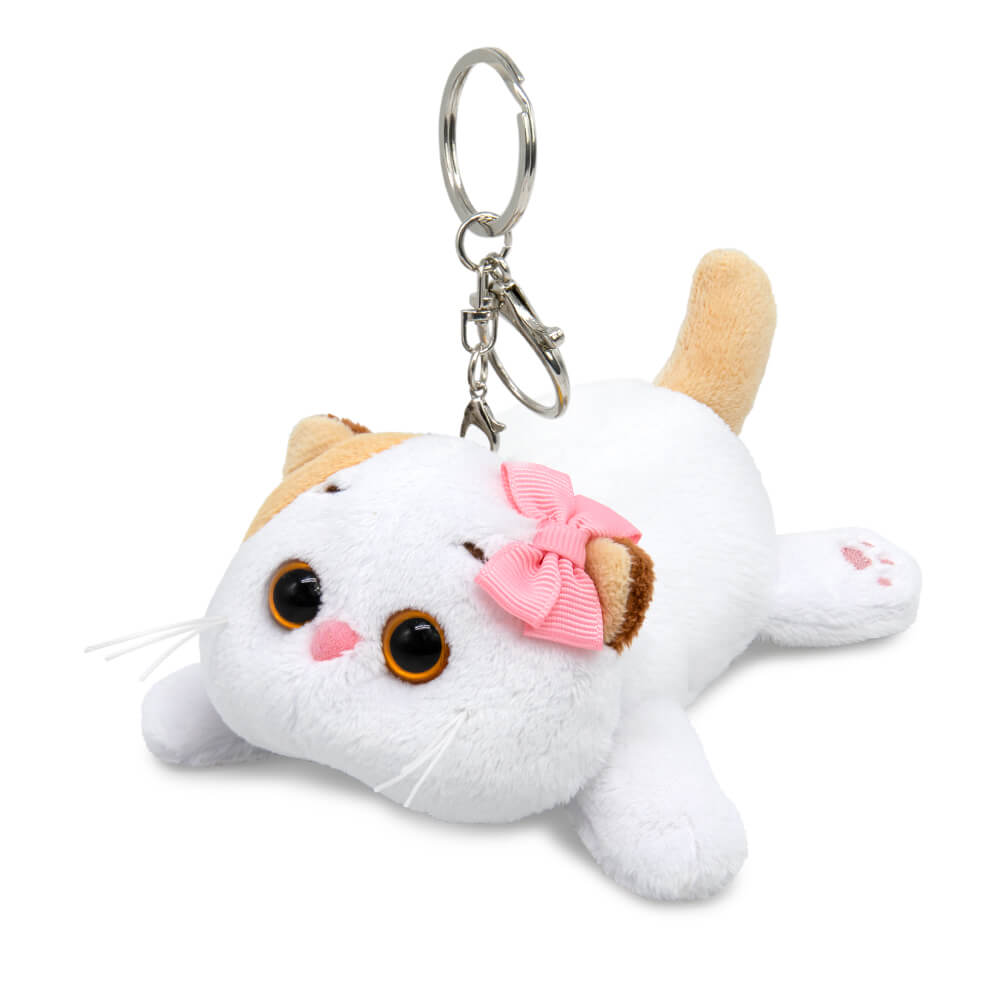 Очаровательный брелок Ли-Ли необычной формы – кошечка лежит на животике. На ушке малышки милый розовый бантик из сутажной ленты. У брелка удобный составной карабин с кольцом и застежками.