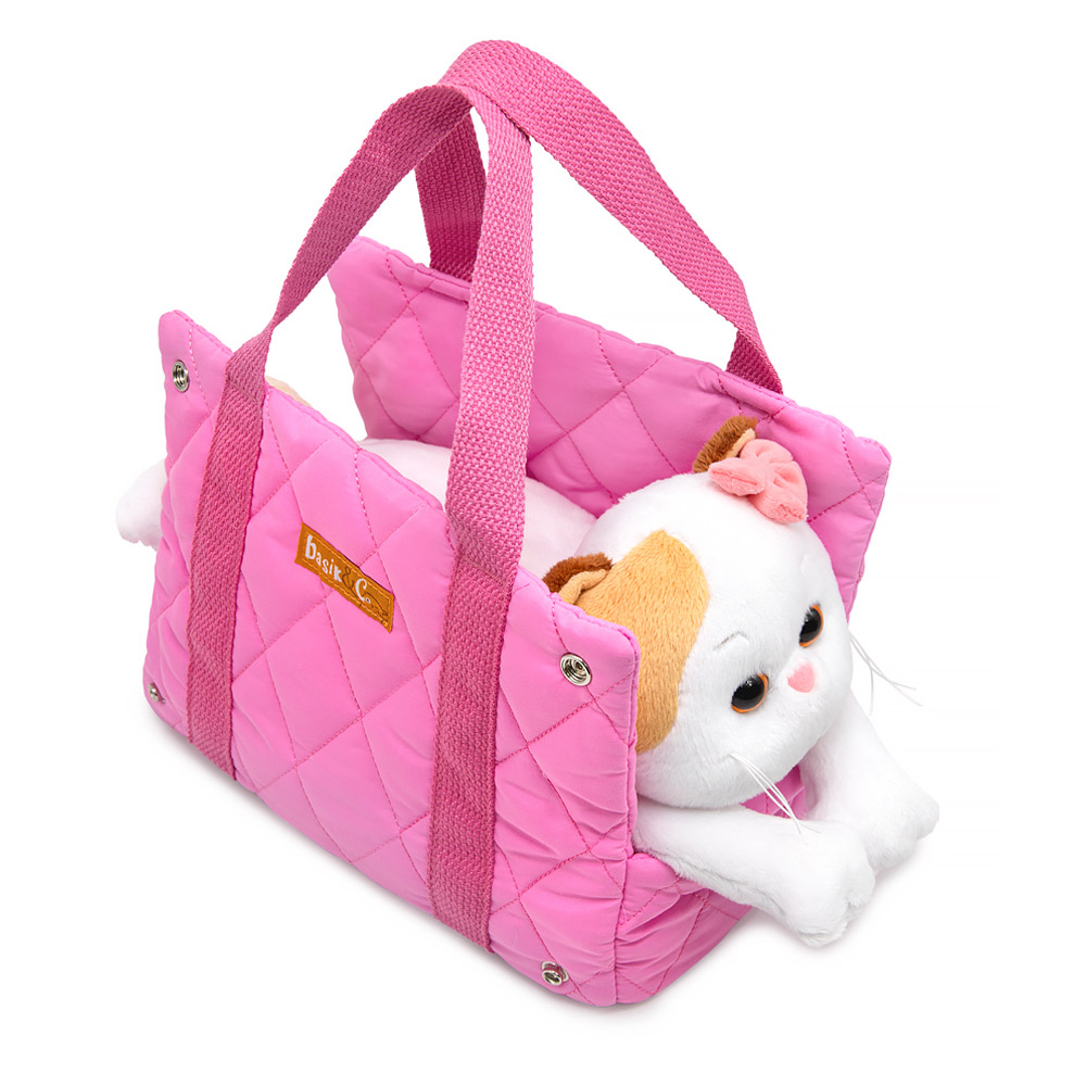 Кошечка Ли-Ли мило расположилась в классной сумке-переноске. На ушке Ли-Ли милый двойной бантик из розового софта. Сумка-переноска сшита из розовой смесовой ткани со стёжкой, с матрасиком внутри, с крепежом на кнопки для фиксации положения стенок, а также ручками из текстильной ременной стропы цвета розовой карамели.
