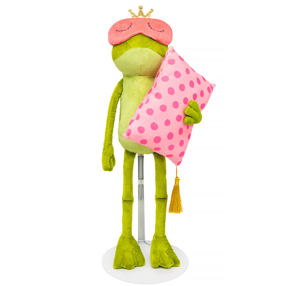 Джейн держит в лапках розовую в горошек подушку с золотистой кисточкой пришитой к уголку подушки. На голове Джейн розовая маска для сна из софта с вышитыми спящими глазами и золотистой короной.