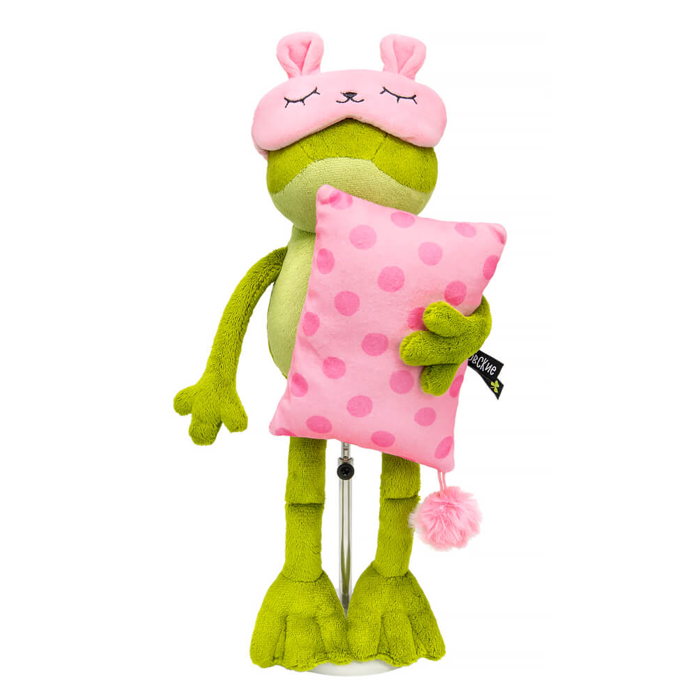 Малышка Оливия держит в лапках мягкую розовую подушечку в горошек с розовым помпоном. На голове Оливии розовая маска для сна в виде мордочки зайчика.