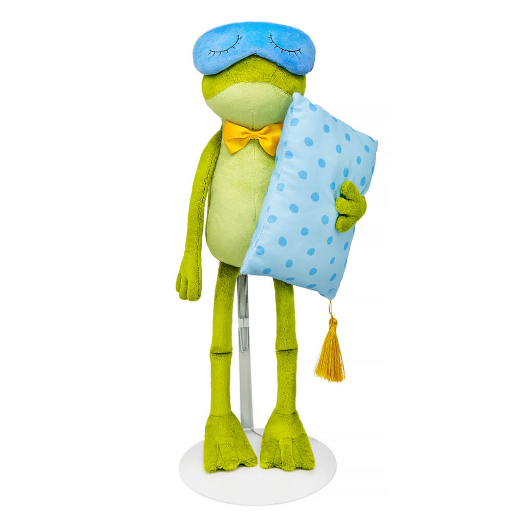 Серж держит в лапках голубую в горошек подушку с золотистой кисточкой пришитой к уголку подушки. На голове Сержа голубая маска для сна из софта с вышитыми спящими глазами. На шее золотистый галстук-бабочка.