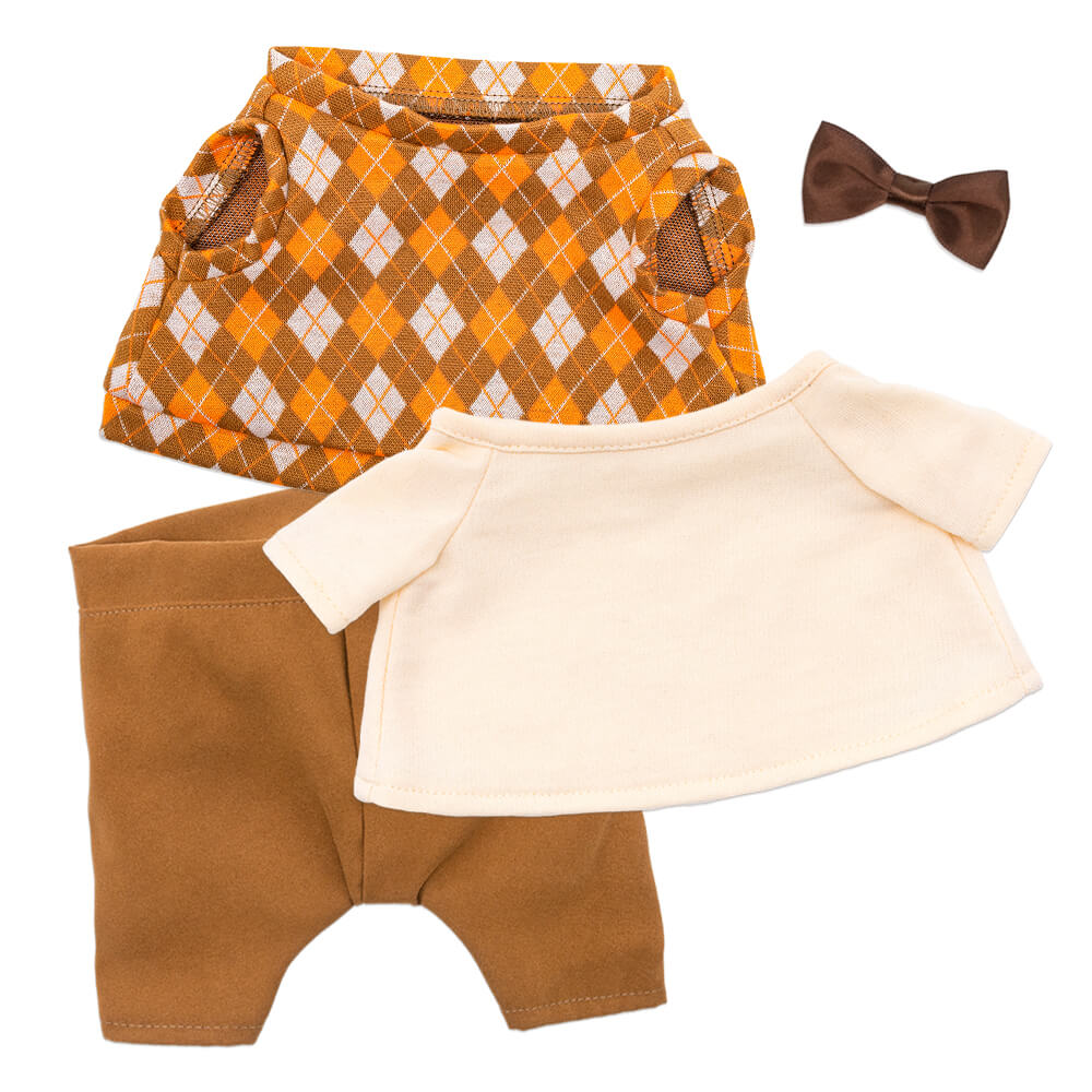 Жилет из жаккардового трикотажа в ромбик. Штанишки из бархатистой плотной ткани цвета горчичного мёда и лонгслив из х/б трикотажа молочного цвета. Атласный галстук‑бабочка шоколадного цвета.