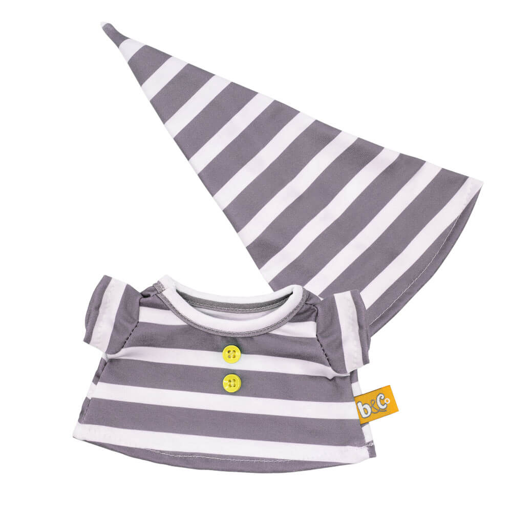 Модная пижама в серую полоску с яркими желтыми пуговичками. В комплекте идет удобный спальный полосатый колпак