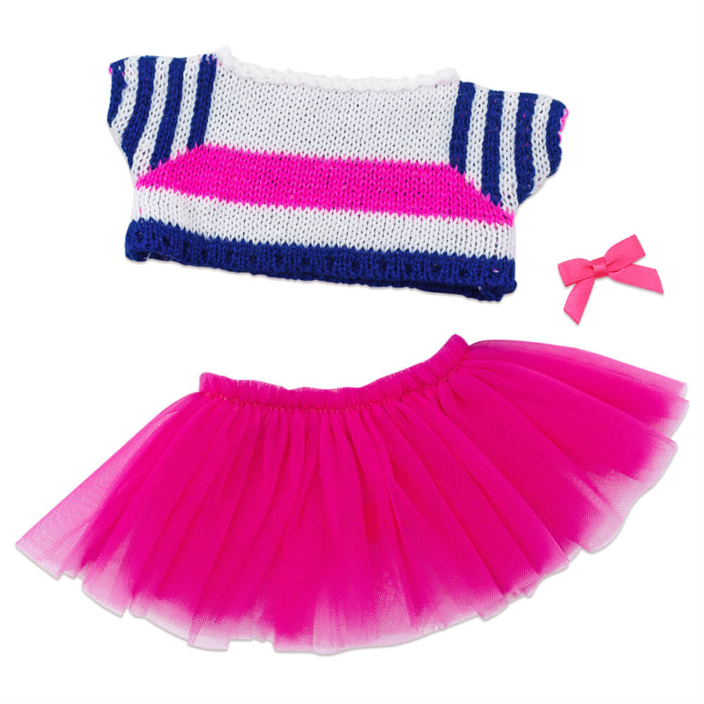 Необычный свитер, связанный из нежного акрила в полоску разного цвета и разной ширины. Также пышная юбочка из тончайшей сеточки цвета розовой азалии. Милый атласный бантик можно прикрепить к ушку.