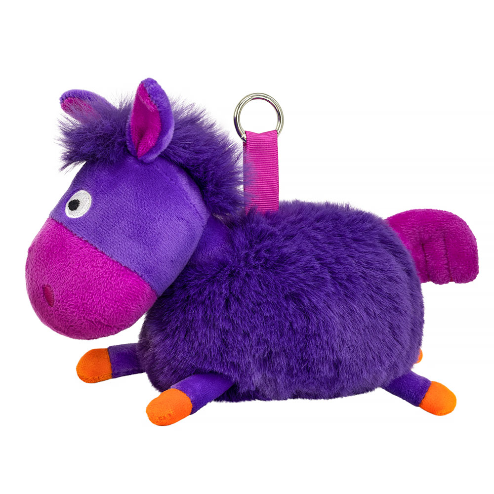 Лошадка-подвес Бен сшит из сочно-фиолетового меха с вышитыми глазками. Мордочка, ножки, ушки и хвост сшиты из фиолетово-сиреневого и ярко-розового софта. Копыта из оранжевого софта. Подвес из ярко-розовой репсовой ленты с серебристым разъёмным кольцом.