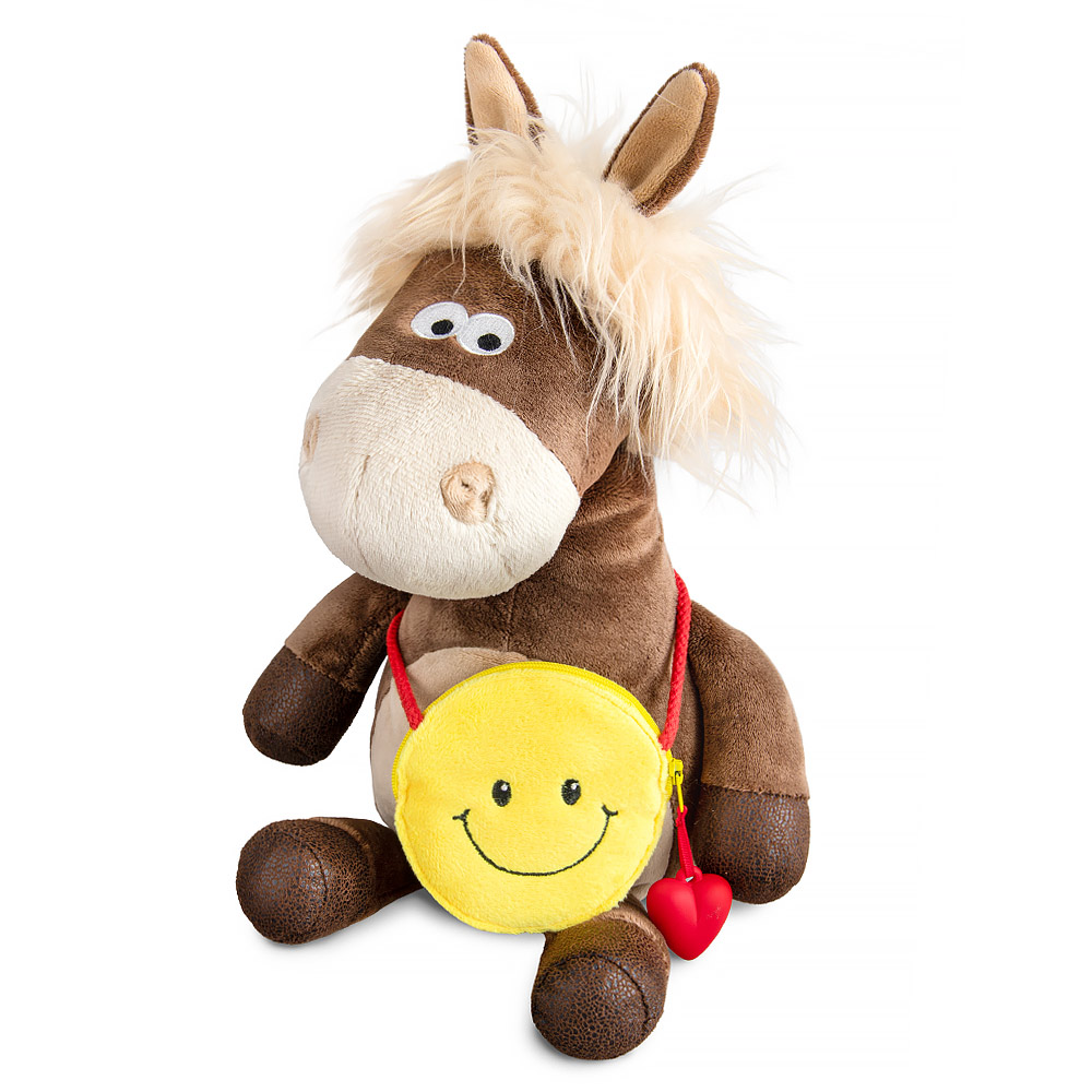 Конь Дин сшит из софта цвета молочного шоколада, животик из кремового, а мордочка из молочного. Копыта из коричневой экокожи. Грива и хвост из длинного меха цвета сливочного крема. Глазки вышиты. Через плечо у Дина необычная жёлтая сумочка с вышивкой в виде смайлика, на красном плетёном шнурке и с алым подвесом в виде сердечка.