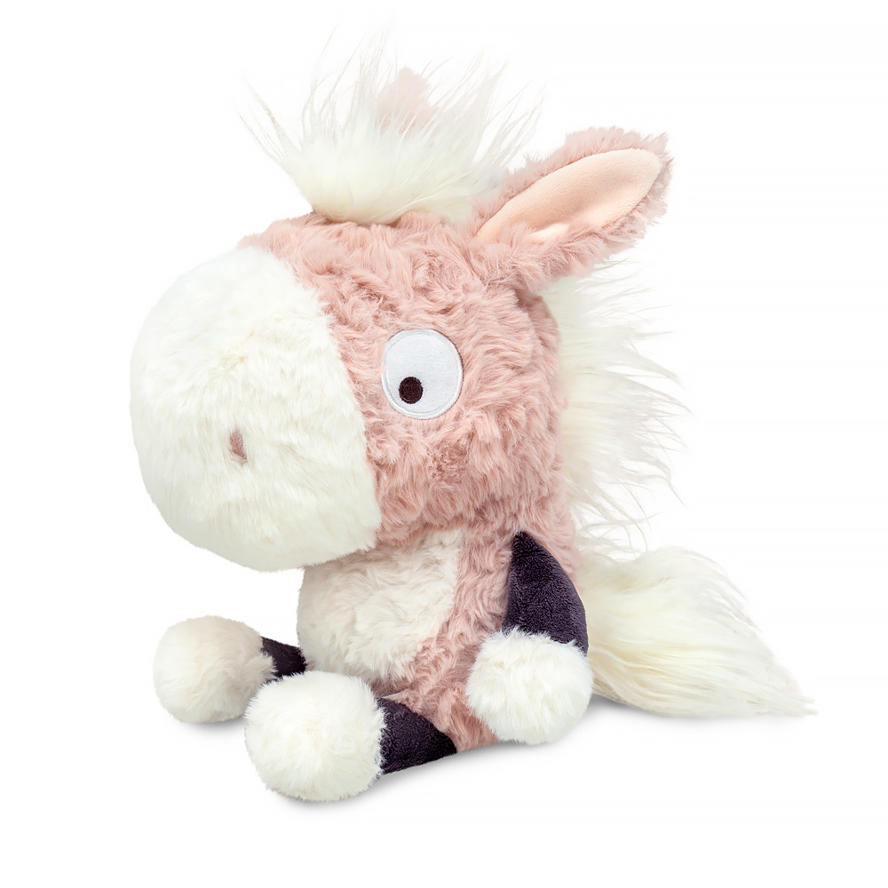 Очень нежная малышка Элинор сшита из тактильно-приятного меха с небольшим завитком жемчужно-розового цвета. Мордочка, грудка и копыта из молочного мягкого меха, а сами ножки из фиолетово-серого софта. Грива и хвост из длинного прямого меха. В ушки вшит бледно розовый софт.