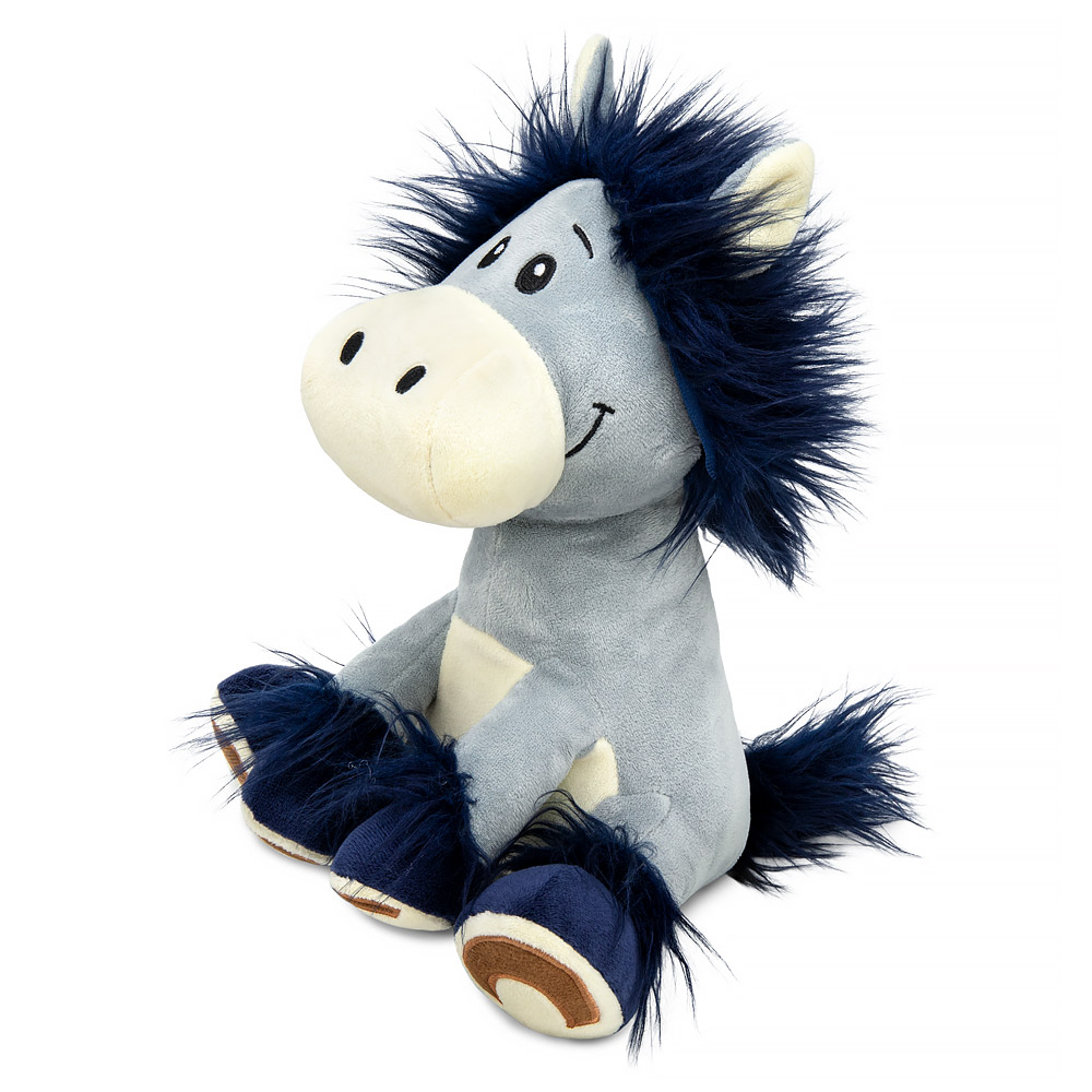 Забавный, небольшого размера конь Флинн сшит из серо-голубого софта с белым животиком и белой мордочкой. Грива, хвост и отделка на ногах из длинного прямого меха сапфирово-синего цвета. Копыта из синего софта с аппликацией в виде подковы.