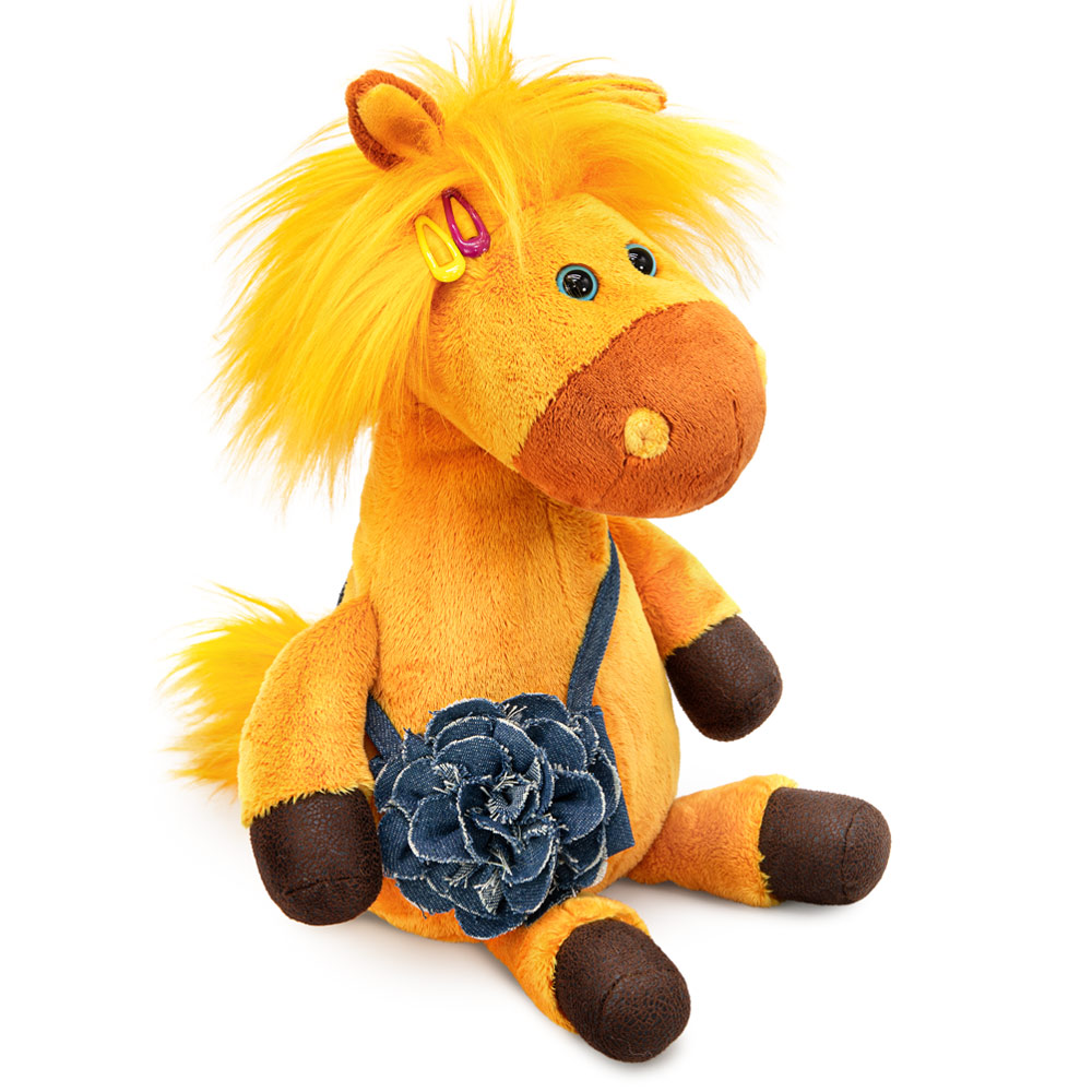 Кейти сшита из софта в золотисто-оранжевых тонах. Хвост и грива у лошадки из длинного прямого меха, копыта из коричневой экокожи. Грива заколота двумя маленькими яркими заколками. Через плечо у Кейти модная джинсовая сумочка с нашитым цветком.