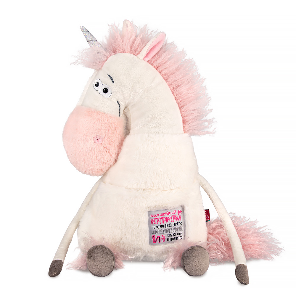 Необычный конь-единорог с карманом для списка желаний. Конь сшит из молочного меха и софта. Мордочка из нежно-розового меха. Грива, хвост и отделка на ногах из кудрявого длинного меха в тон мордочки. Рог из серебристой ткани. Копыта из дымчатого софта. На кармане у коня-подушки забавная нашивка с надписью.