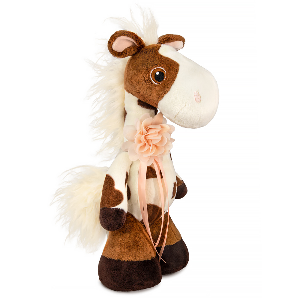 Красотка Маро на устойчивых ногах сшита из молочного короткого меха с пятнами цвета молочного шоколада. Пушистая грива и хвост из кудрявого меха жемчужного оттенка. В ушках бледно-розовый софт, а копыта шоколадного цвета. На груди у Маро очень нежный цветок из тончайшего крепа цвета розовой воды, украшенный длинными лентами в тон.