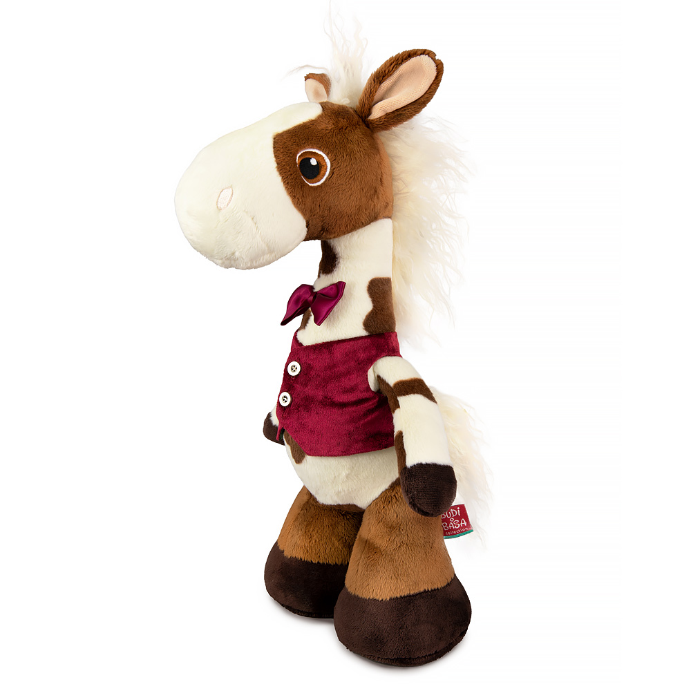 молочного шоколада. Пушистая грива и хвост из кудрявого меха жемчужного оттенка. В ушках бледно-розовый софт, а копыта шоколадного цвета. Мэйс стоит в бархатном жилете цвета спелой вишни на серебристых пуговках. Также на шее коня Мэйса атласный галстук-бабочка в тон жилета.