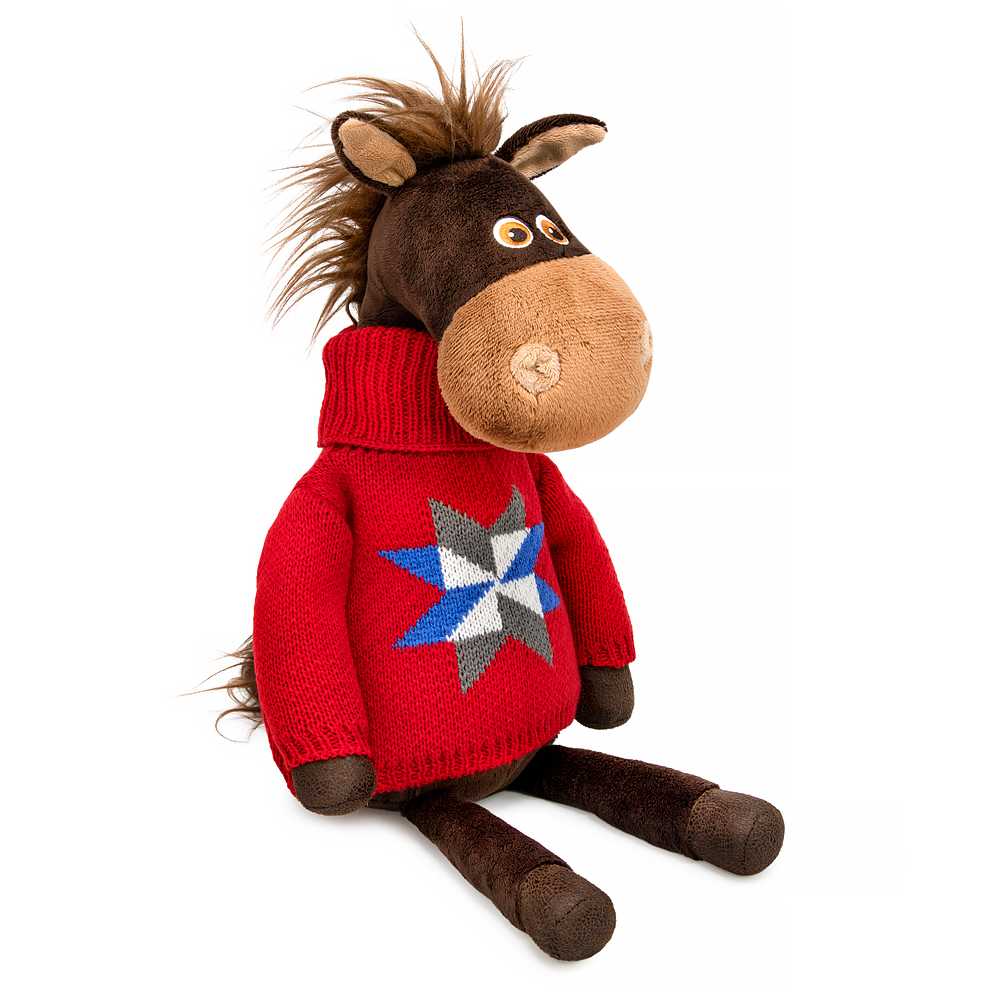 Конь Рассел сшит из софта в песочно-шоколадных оттенках. Грива и хвост из длинного коричневого меха. На Расселе классный вязаный свитер алого цвета с орнаментом в виде трёхцветной норвежской звезды.