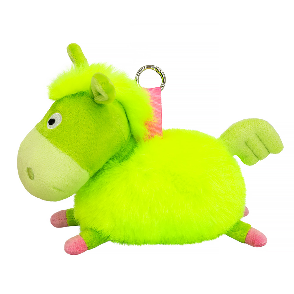 Лошадка-подвес Рони сшит из неоново-лаймового меха с вышитыми глазками. Мордочка, ножки, ушки и хвост сшиты из двух оттенков лаймового софта. Копыта из розового софта. Подвес из розовой репсовой ленты с серебристым разъёмным кольцом.