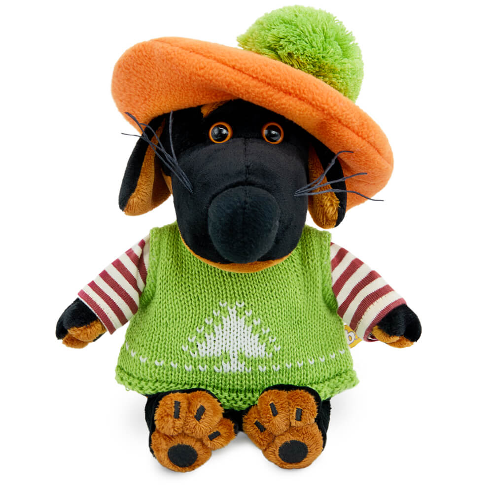 Малыш Ваксон в ярком, вязаном жилете из акрила цвета зелёного лайма с пришитыми рукавами из х/б трикотажа в терракотово-белую полоску. Спереди на жилете белыми нитками вывязано милое деревце. Также на Ваксоне объёмный берет из золотисто-оранжевого флиса с большим лаймовым помпоном из пряжи.
