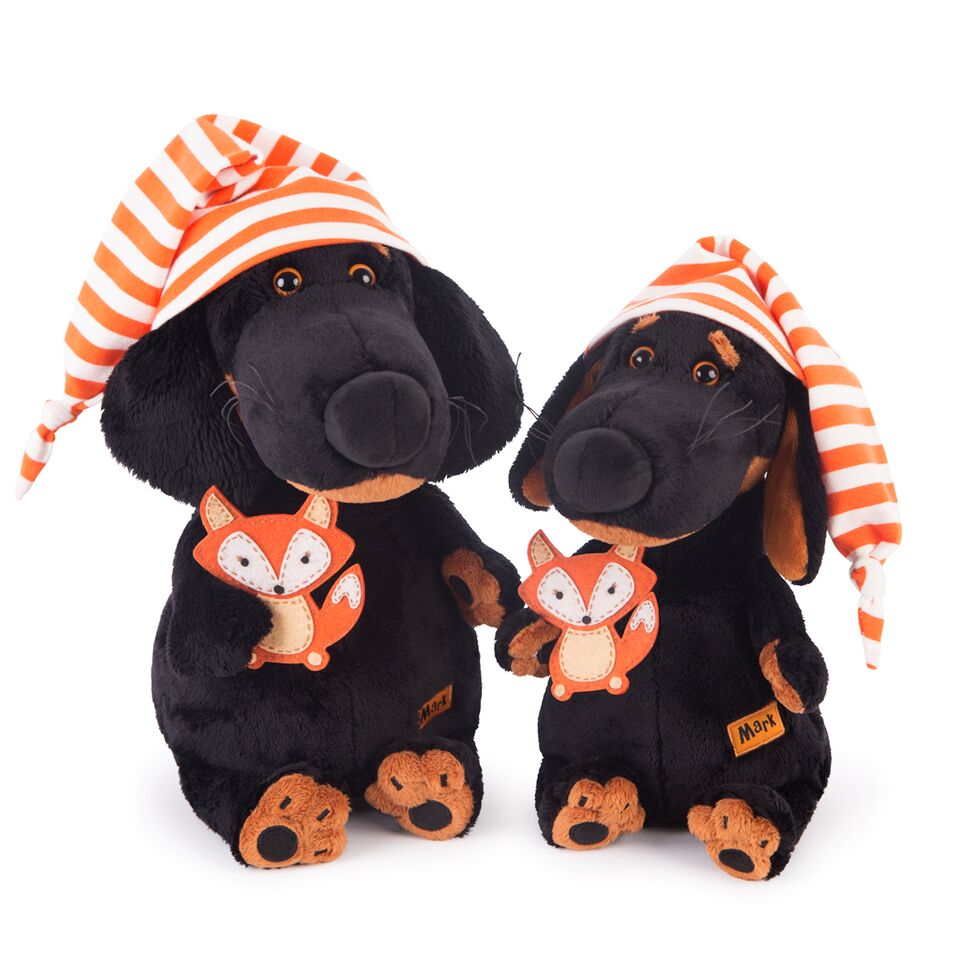 Марк Ваксон в колпачке для сна из плотного х/б трикотажа бело-оранжевую полоску. В лапках Ваксон держит фетровую лисичку, оригинальную игрушку на пальчик. Такой игрушкой можно играть отдельно и даже собрать свой пальчиковый театр.