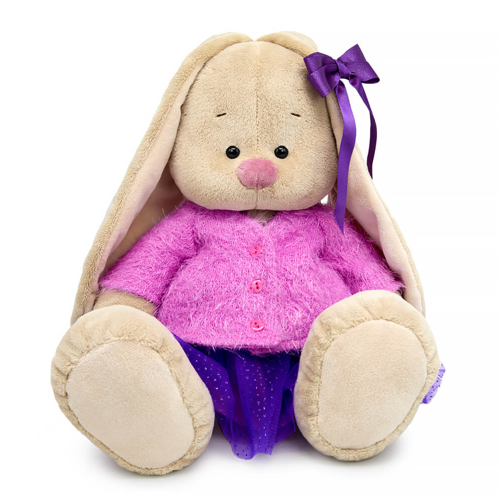 На Зайке Ми классный яркий кардиган цвета розового мармелада. Кардиган сшит из очень модной ткани «травка» и с застёжкой на розовые пуговки спереди. Также на Зайке пышная юбочка из фиолетовой сеточки с вкраплениями фольги и с розовой подкладкой. На ушке Зайки фиолетовый атласный бант, завязанный вручную.
