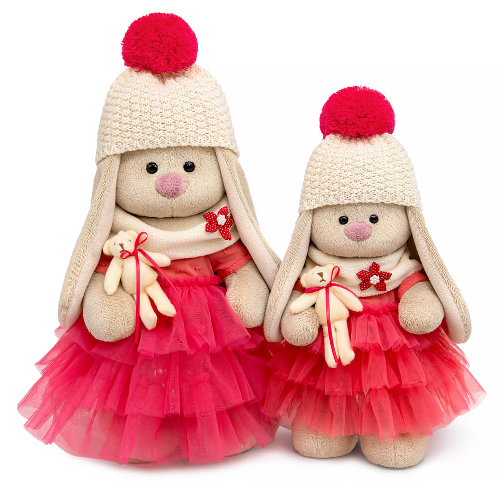 Зайка Ми в шикарном наряде. На ней красное платье из хлопка с выработкой и красно-малиновой сеточки, нежно-бежевый снуд из флиса и вязаная шапочка, в тон снуда, с объёмным алым помпоном. Снуд украшен красным в горошек цветочком с жемчужинками в центре. В лапках Зайка Ми держит милую игрушку – мишку молочного цвета с красным атласным бантиком. Игрушку при желании можно использовать как подвеску.