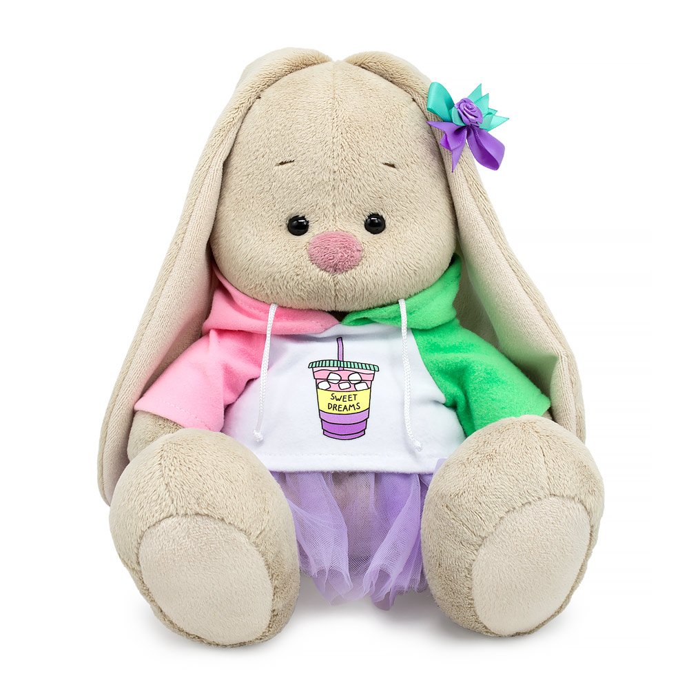 Зайка Ми в очень нежном свитшоте с капюшоном. Свитшот сшит из белого, розового и цвета весеннего бутона трикотажа с начёсом. Спереди на свитшоте термонаклейка в виде стаканчика с напитком. Также на Зайке пышная юбочка из сеточки дымчато-лавандового цвета. На ушке Зайки составной бантик с розочкой.