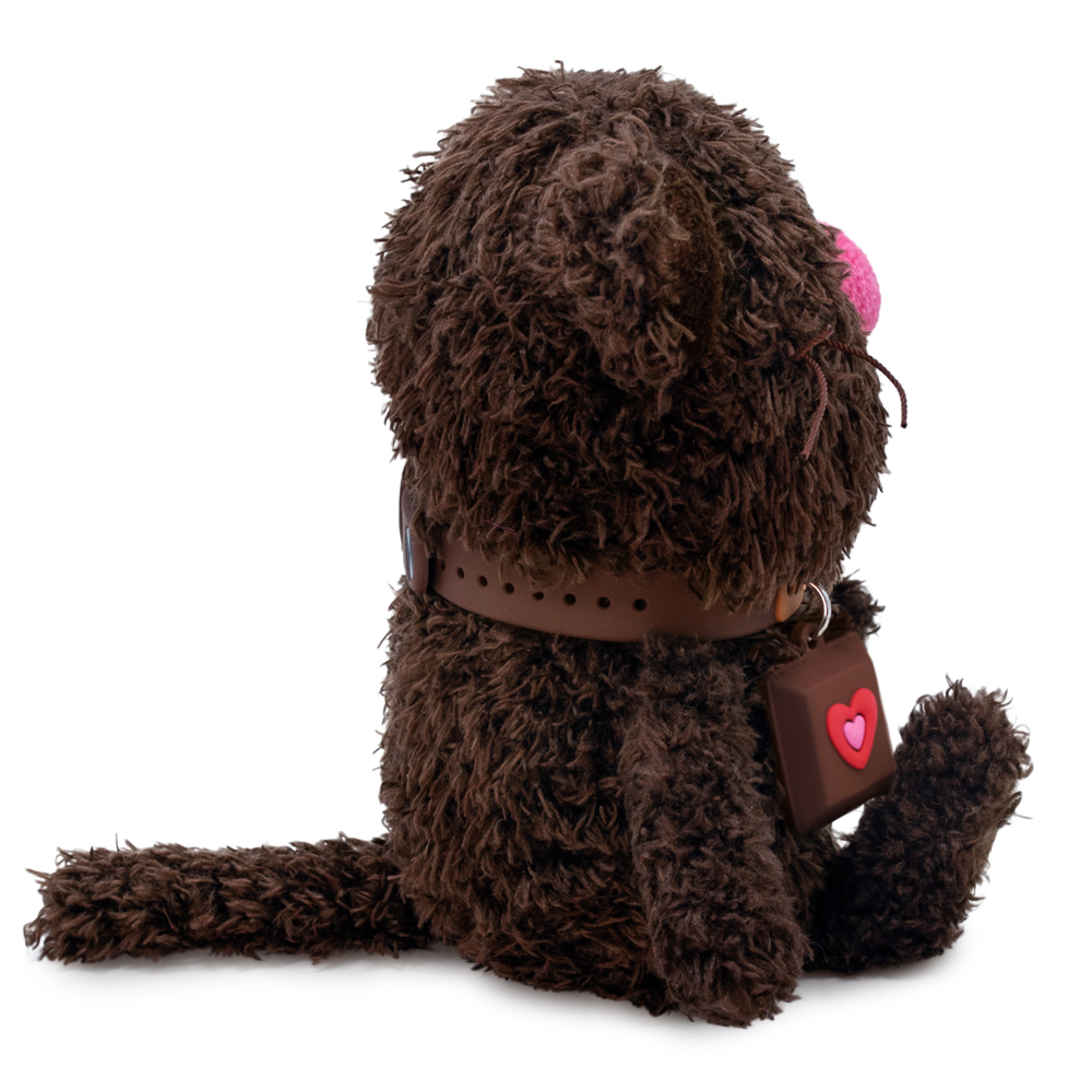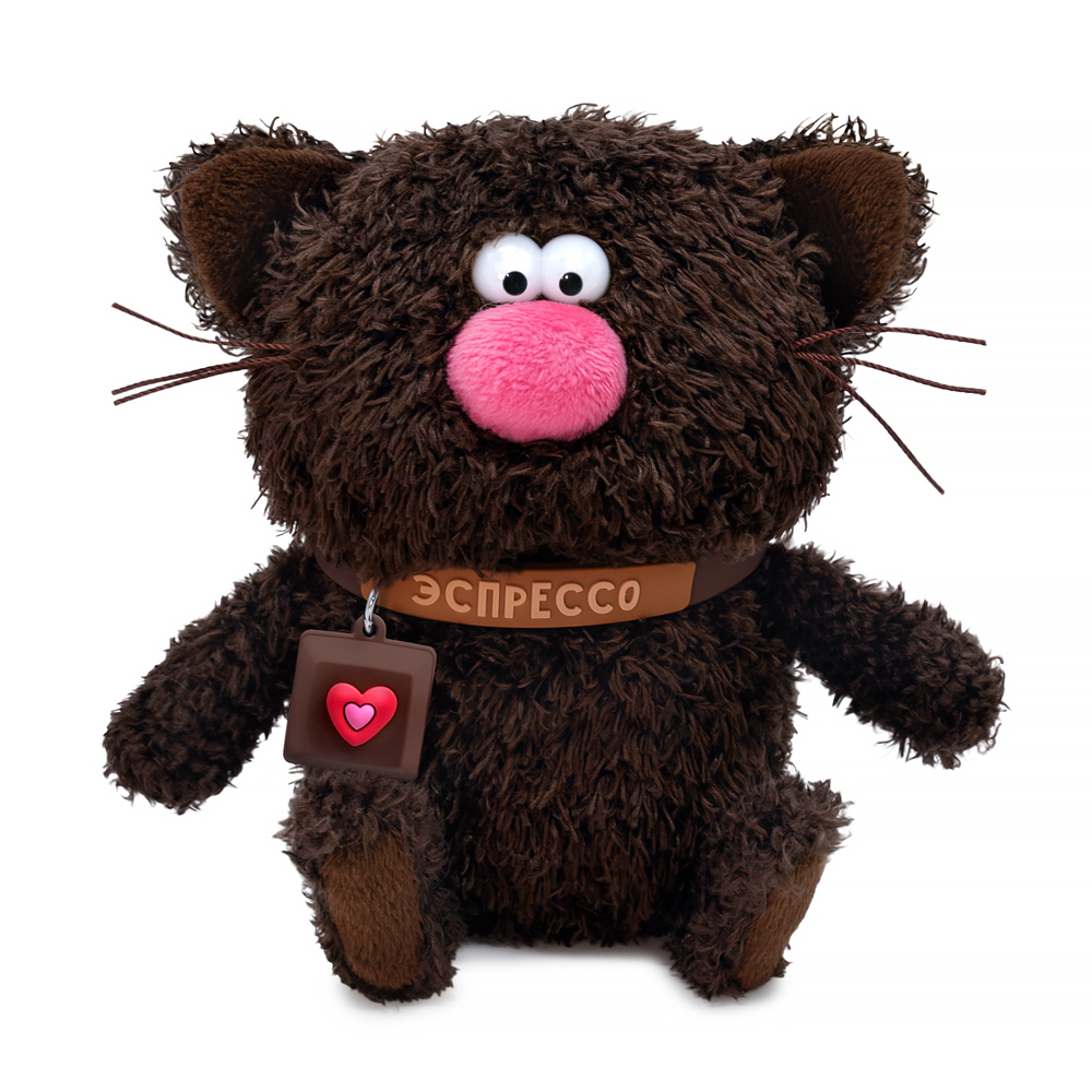 Милый котёнок Эспрессо из тактильно приятного эко меха цвета горького шоколада. Лапки и хвостик из более короткого меха. Усики из шелковистого крученого шнура. Объемный носик обтянут розовым софтом. Глазки из пластика. На пяточках и внутри ушек вшит темно‑коричневый софт. На шейке у котёнка силиконовый чокер с названием и небольшим подвесом в виде чашечки с кофе эспрессо. Чокер легко снимается и может послужить в качестве модного браслета для хозяина.