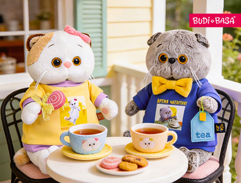 Кот Басик надел синий свитшот с надписью «Время чаепития!» и взял в лапку маленький чайный пакетик, совсем как настоящий, сделанный вручную! А кошечка Ли-Ли пришла в лимонном свитшоте с надписью «Время веселиться!» и держит розовый леденец.